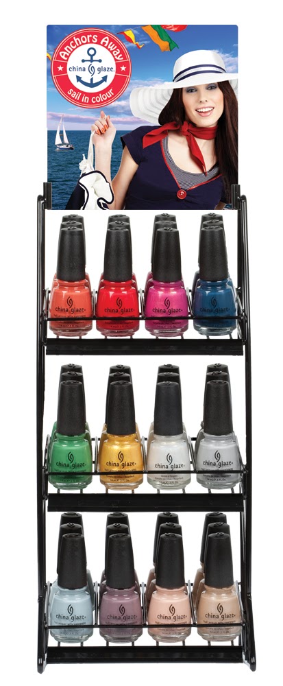 The China Glaze Anchors Away collection will be available in two 6 piece acetates, a 12 piece display, a 36 piece rack, and as open stock colors.